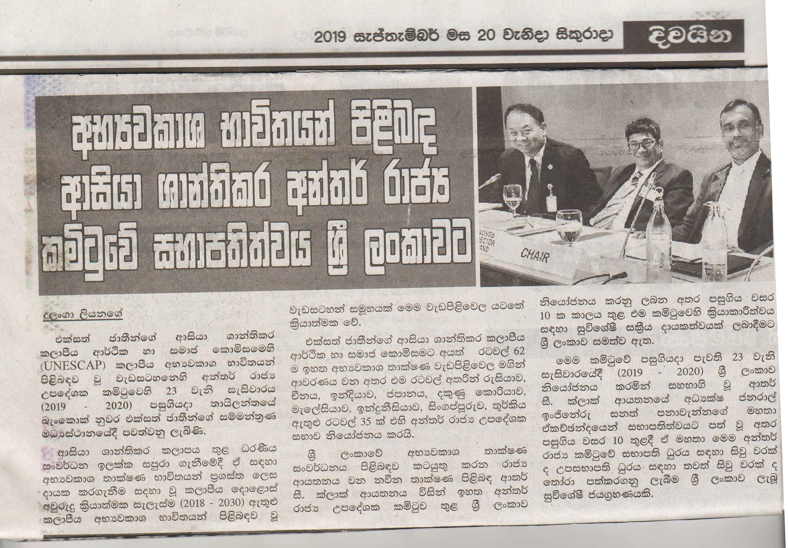 අභ්‍යවකාශ භාවිතයන් පිළිබද ආසියා ශාන්තිකර අන්තර්ජාතික රාජ්‍ය කමිටුවේ සභාපතිත්වය ශ්‍රී ලංකාවට