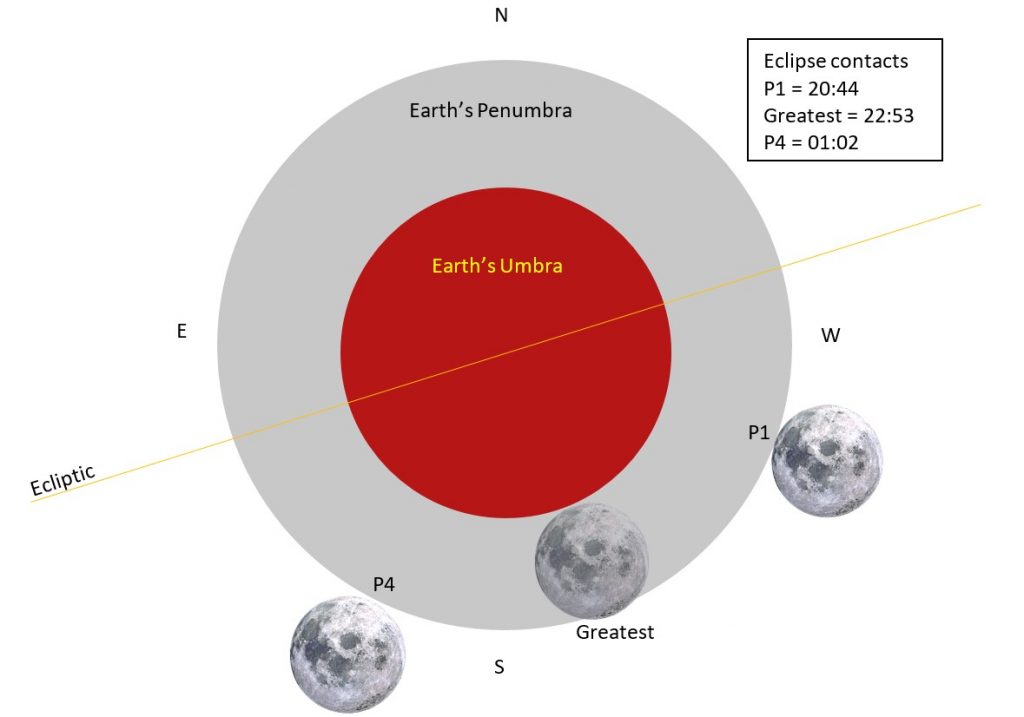 A Penumbral lunar eclipse is visible to Sri Lanka on 5th May, 2023, the Wesak Poya day. Eclipse starts at 20:44, mid eclipse occurs at 22:53 and it ends at 01:02. A penumbral lunar eclipse occurs when the Moon passes through the Earth’s penumbra, the outer part of the shadow that the Earth casts in space. During this type of eclipse, the Moon appears slightly dimmer than usual, but it does not become completely dark or red like it does during a total lunar eclipse.