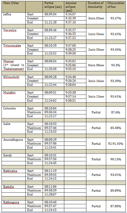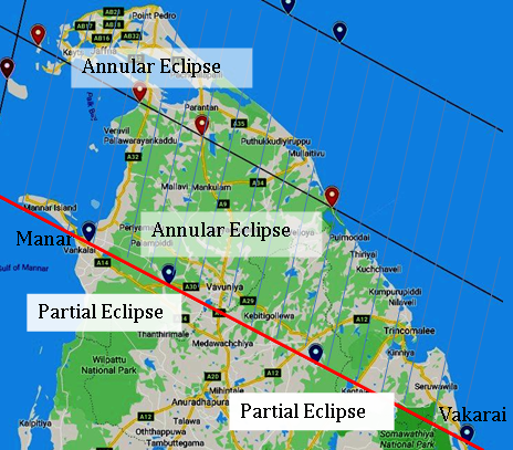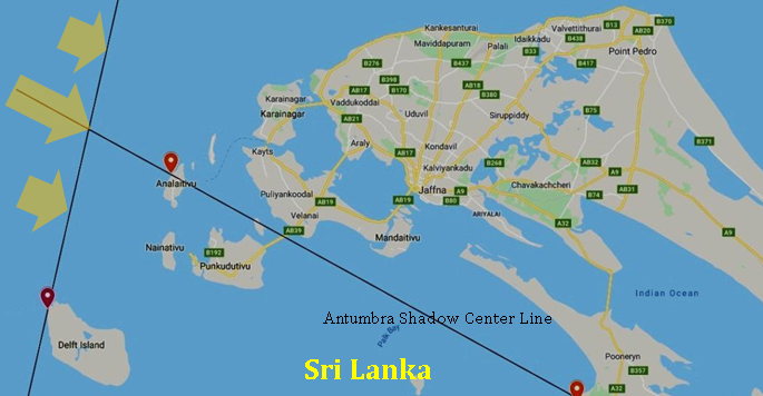 The both partial and annular phases (Penumbral and Umbra shadow) of the eclipse will be first touched on Sri Lankan lands at 8:08:44.0 a.m. and 9.33.16.7 a.m. respectively on Delft Island in Jaffna area. When at this penumbral first touch the Sun will be at the altitude of 22.10 while when the Sun reach at the altitude of 39.20 the Umbra shadow will touch the Sri Lankan lands. The center line of the of the umbra shadow enter Sri Lankan tertiary through Analathivu Island in Jaffna , crosses the A9 road close to Murikandi, Iranamadu area and traverses along Kokuthuduwai in Welioya area.
