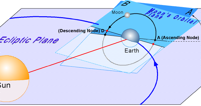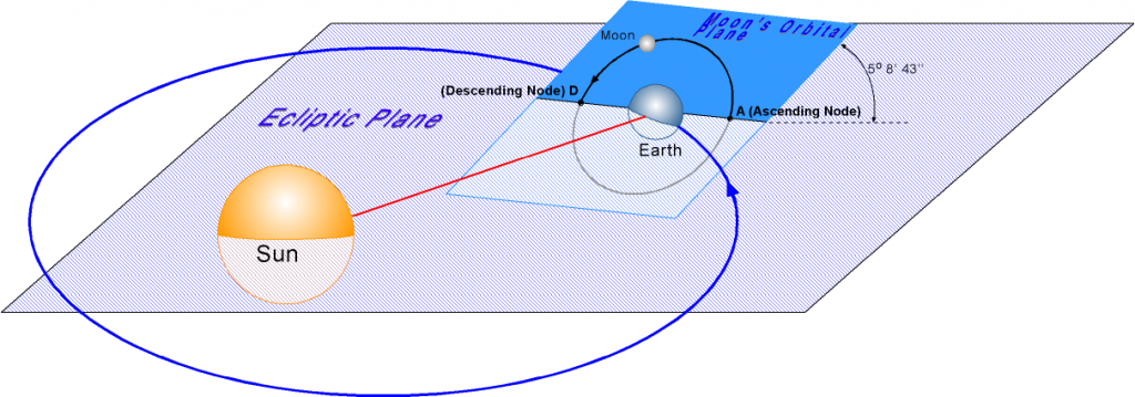 All solar eclipses involve when the Moon’s elliptical orbit which 50 inclined to the plane of the Earth’s orbit (ecliptic), passing between the Earth and the Sun. When the Moon’s orbit crosses the ecliptic plane at the points referred as nodes, the Moon casts a shadow on the Earth (Figure 2). Depending on whether the Moon passes directly, or only partly, between the Earth and Sun, and the location on Earth you stand to observe it, the solar eclipse can be divided as Total, Partial, Annular and Hybrid.  The other very important factor which determines the type of the eclipse is the anomalistic month. The moon takes 27.554549 days to travel from apogee to perigee and back again during the anomalistic month. The Apogee is the point in the Moon’s orbit that is farthest from the Earth and the Perigee is the point in the orbit of the Moon that is closest to the Earth. Therefore the types of the eclipse as well as the size of the eclipse depend on the distance from the Earth to the Moon during the eclipse; and this distance depends on the point during the Anomalistic Month when the eclipse occurs.