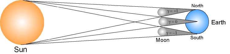 Gamma parameter conveys the distance, in terrestrial radius, between the Moon’s shadow axis and the Earth’s centre. Gamma = 0 means the axis of the umbral cone goes right through the Earth’s centre; gamma < 0 means the axis goes South of the Equator; gamma > 0 means the axis goes North of the Equator; gamma = ±1 means the axis is the tangent of the Earth in its North or South Pole. A solar eclipse could be visible on Earth up to gamma ≈ ±1.5. The place where the umbral cone axis intersects the earth surface is the maximum point of the total or annular eclipse.