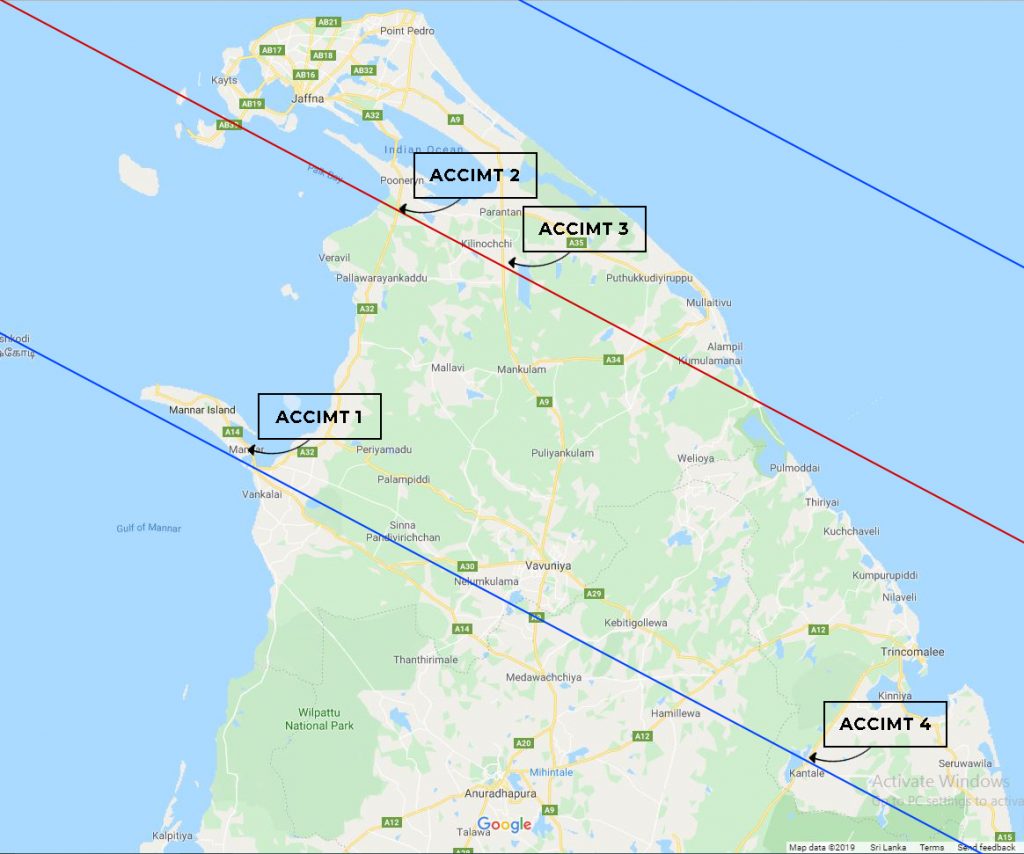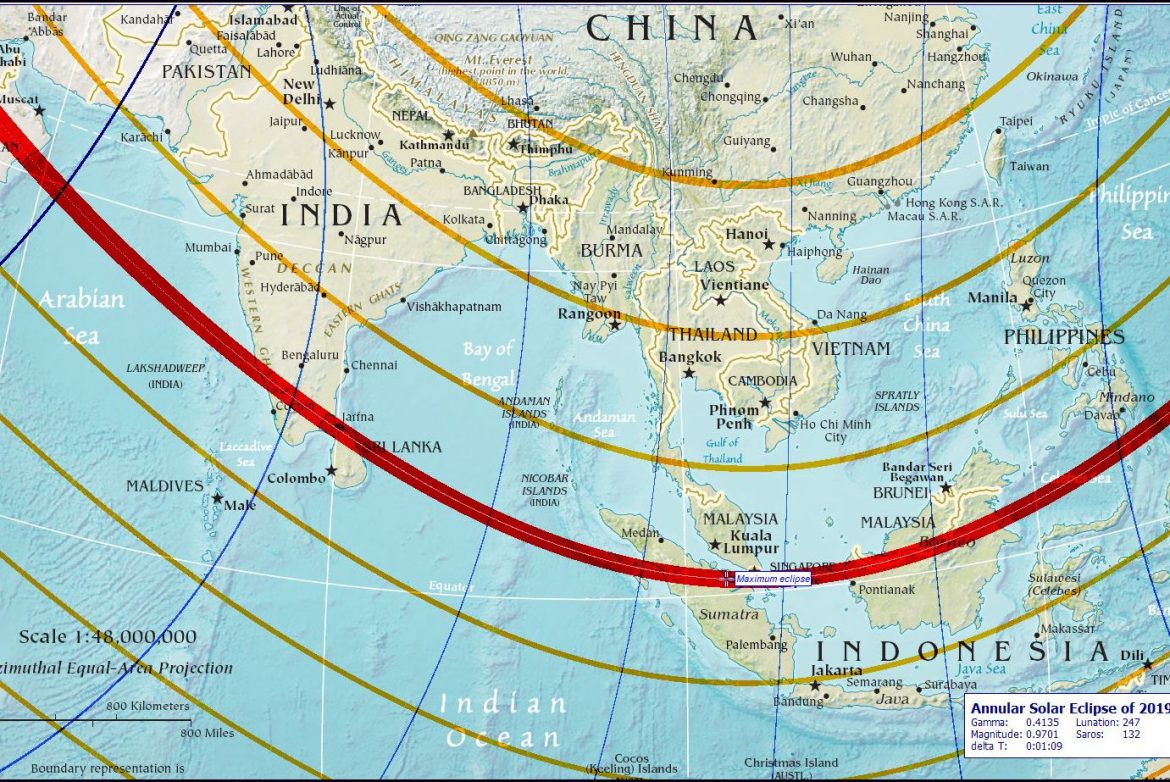 The Annular phase of the eclipse begins approximately 180 kilometers West of Dammam in the desert of eastern Saudi Arabia around 9.04 a.m. (Sri Lankan Time). The greatest eclipse happened when the axis of moon’s shadow becomes shortest at  010 00.3’ N latitude and 1020 16.5’ E longitude at 10.47.36 a.m. (Sri Lankan Standard time) close to Padang Island in Sumaththra Indonesia. While the annular eclipse path is around 130 km wide at this occasion the annular phase will last 03 minutes 39.5 seconds (03min 39.5s) and 94% of the solar disk is covered by the Moon.