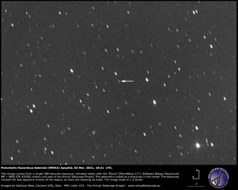On March 6, 2021 the potentially hazardous asteroid Apophis will pass the Earth at its closet distance of 16,852,899 Km in recent years. The size of Apophis is about 340m and orbits around the Sun in 323.6 days, much faster than the Earth.