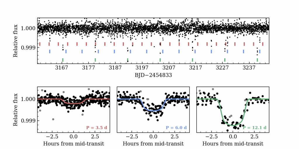 At ACCIMT, we have used the data released from the Kepler spacecraft to find new exoplanets, and at present we have had success in detecting two new planetary systems around what are known as Orange dwarf stars. The method of detection utilized to find these planets is what is known as the transit method, where the variation in light from a star as an exoplanet passes in front of it is used to discern its existence and determine its properties. One of the system’s we found contains two planets with orbital periods of 13 and 65 days with sizes of 2.6 and 2.7 Earth-radii respectively, and we have determined them to be what are called “sub-Neptune” type exoplanets (planet that are most likely gaseous like Neptune). The second system we found contains three planets with orbital periods of 3.5, 6 and 12 days, with sizes of 1.1, 2.2 and 3.2 Earth-radii respectively. This second system contains a definite rocky planet orbiting very close to the host star as well as a definite gas giant orbiting further away. Further studies are being conducted on these systems as well as investigations into new stars that are possible candidates for new planetary systems. We show below the transit light curves that were obtained for the two systems mentioned above, which is evidence of these new planets which we have found.