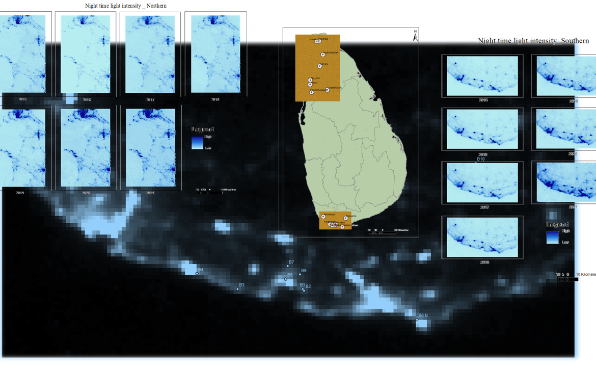 This assignment involved the use of night-time light data derived from satellite imagery for analyzing the changes on speed of increase of the light intensity before and after construction of the bridges along the road network. It constituted processing of satellite images from 2014 to 2021, covering the Northern and Southern provinces of Sri Lanka, using GIS and Remote Sensing techniques and performing a descriptive statistical analysis.