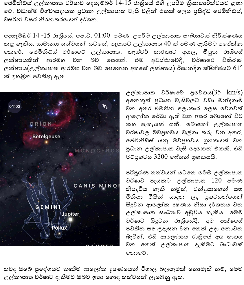 Observe Geminids Meteor shower in Sri Lankan skies Posted on December 15, 2025December 15, 2025 by adminරාත්රී අහසසේ දෙසැම්බර් 14-15 නිරීක්ෂණය වන ජෙමිනිඩ්ස් උල්කාපාත වර්ෂාව