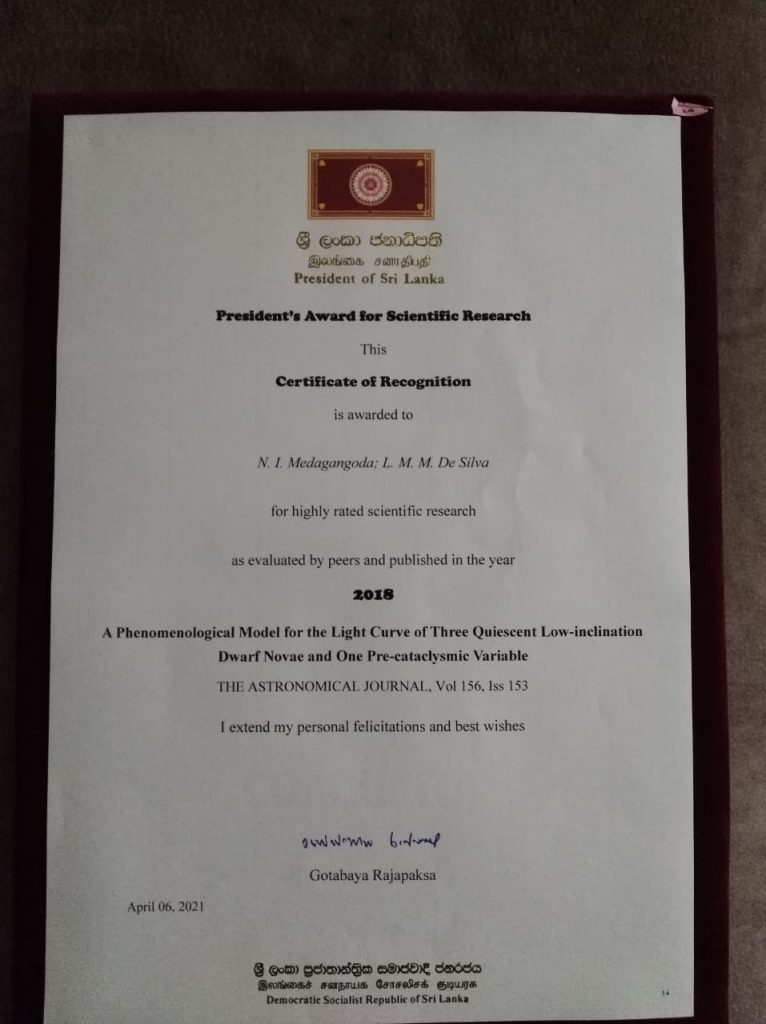 President’s Award for Scientific Research is awarded to N.I. Medagangoda (ACCIMT) and L M. M. De Silva for highly rated scientific research