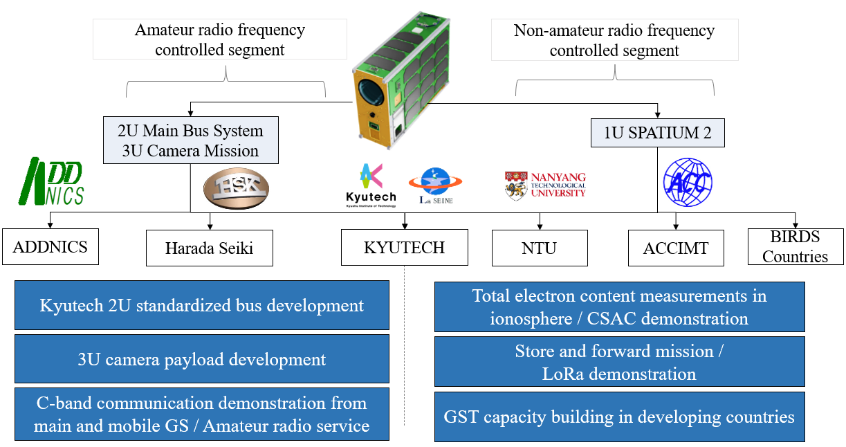 KITSUNE carried six research and experimental missions, as detailed below. Notably, they included two payloads from the commercial space industry partners—a transceiver for ground-to-space communication by Addnics Corporation, and an Earth observation camera by Harada Seiki Corporation—which were intended to be tested in orbit, and a new low-cost UHF transceiver developed by the ACCIMT Research Engineer Tharindu Dayarathna.