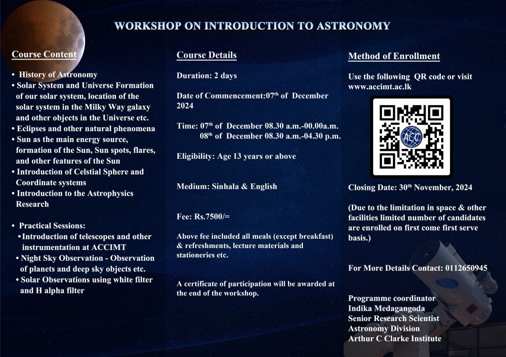 Workshop on Introduction to Astronomy – 2024 Posted on October 27, 2024October 28, 2024 by admin Registration URL : https://docs.google.com/forms/d/e/1FAIpQLScaWIgmfDpmyKB6fD4bx8yfF02cKiBhsv1RhEm6M_M6RwNfgg/viewform Application (Sinhala) Aplication (English) Brochure